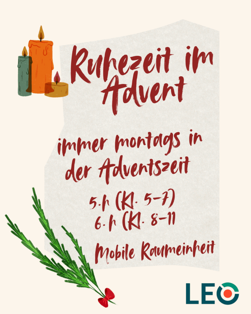 Die Mittagspausen an Montagen in der Adventszeit dürfen langsam sein. Kommt vorbei, findet Ruhe, spürt die warme Atmosphäre und lasst euch zu schönen Gesprächen einladen. Die Religionslehrerinnen (Fr. Sommer, Fr. Schirmer, Fr. Müller & Fr. Stamann) freuen sich auf euch und haben immer kleine kulinarische Überraschungen vorbereitet.